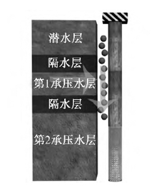 对于第2承压观测井,如果在施工时没有将第2承压水层与第1承压水层密实地隔离开,导致第1承压水与第2承压水串通(见图6),深水观测井的变化往往要大于第1承压水层观测井的变化,而后变化幅度趋于一致。因为假如2个水层没有隔离开,第1承压水层水肯定会往第2承压水层方向流,进而形成平衡,而如果第1承压水层水位变化,流向第2承压水层的水减少,则会导致深层观测井水位下降,再加上第2承压水层水位本身的下降,就会导致深水观测井的变化超过潜水观测井的变化,当两个层承压水变化速率基本一致的时候,又保持一段时间的一致变化速率,这样就失去了监测第2承压水层的作用。