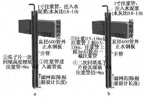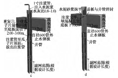 由于减压井均深入到基坑底板下部承压含水层,故需要在基础底板施工完成后,包括养护阶段和地下室及上部结构施工阶段,在确保承压水水头压力不大于抗浮力的情况下,逐步减少减压井的开启数量,直至静止水位情况下水头压力不大于抗浮力,并由结构设计人员复核计算后,再进行封堵。封井步骤如图7所示。