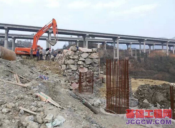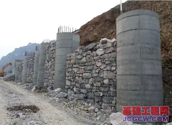 在沿江路靠近江畔一侧,为防止路面上过往车辆和一侧山体对道路的侧向压力,也修建了护坡桩保护道路。如图: