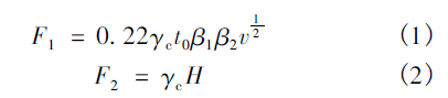 式中:F1,F2为新浇混凝土对模板产生的最大侧压力;γc为混凝土重度,取25kN/m3;t0为新浇混凝土的初凝时间,按商品混凝土为4~6h,本工程取t0=5h;v为混凝土浇筑速度,取v=2.5m/h;H为混凝土侧压力计算位置处至新浇筑顶面的总高度,取H=3m;β1为外加剂影响修正系数,取β1=1.0;β2为混凝土坍落度修正系数,按坍落度170mm,取β2=1.15。