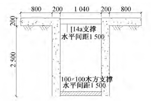 1)地下连续墙施工前首先进行导墙施工,导墙的尺寸和支撑要求如图3所示。导墙施工完成并达到强度要求后开始施工接头钢柱,首先进行钢柱的中心位置放线,确定其位置并在导墙混凝土上做好明确标识。