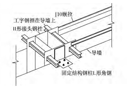 在钢柱接头顶端四侧翼板上按照计算所得的位置开口,将工字钢穿过4个开口横担于导墙上。为防止钢柱接头位移,使用L形角钢与导墙用膨胀螺栓固定牢固,再用[10将所有钢柱接头沿地下连续墙方向水平嵌拉(见图6)。