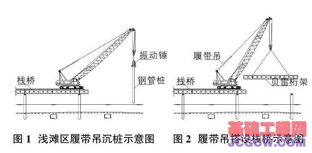 ③搭设施工工艺。栈桥及平台钢管桩基础施工采用50t履带吊吊配合振动打桩锤插打,汽车吊或履带吊吊装纵横梁。