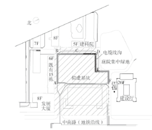 该工程场地极为狭窄,基坑边环境复杂。场地西侧紧邻中南路地铁站,北侧紧邻发展大厦及建设厅15#住宅楼;东侧与建研院相隔一条宽7m沥青道路;东南侧紧邻建设厅2#住宅楼;南侧与世纪大厦相距13m左右。基于复杂建筑环境,基坑设计优化、施工交通组织、安全监测等较为复杂。经过深入分析研究,该基坑支护设计采用高压旋喷桩止水帷幕+钢筋混凝土灌注桩+3道钢筋混凝土内支撑的支护方式,明挖顺作施工工艺。考虑到对地铁工程的影响,支护施工部署采取“先浅后深、分段施工、优先毗邻段”的原则,先行施工距离地铁最近且基坑较浅的纯地下室区域基坑支护及地下室结构,待该区域地下室结构形成后,利用该部分结构对邻近地铁土体的支护作用,进行主楼及综合楼区域的深基坑工程施工,为工程施工安全性提供了保障,并节约了施工工期。