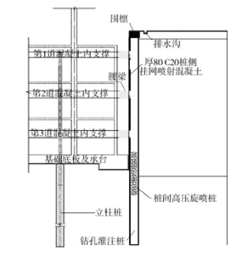 因地制宜,根据开挖深度合理选择支护形式,保障安全的同时,避免支护强度浪费。由于Ⅰ区、Ⅲ区开挖深度较大,选择高压旋喷桩止水帷幕+钢筋混凝土灌注桩+3道钢筋混凝土内支撑的支护方式(图3);Ⅱ区开挖深度较小,采用钢筋混凝土灌注桩+1道钢筋混凝土内支撑的支护方式。