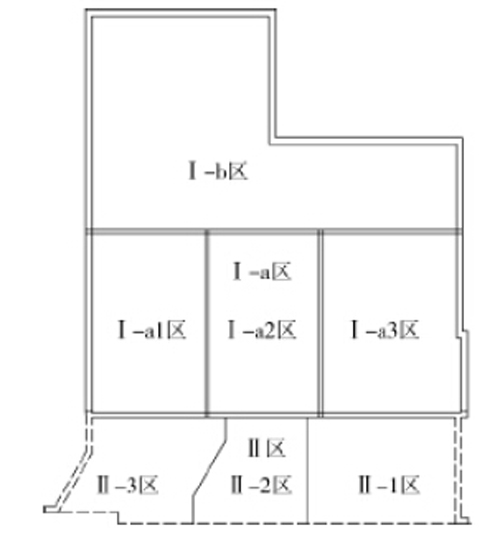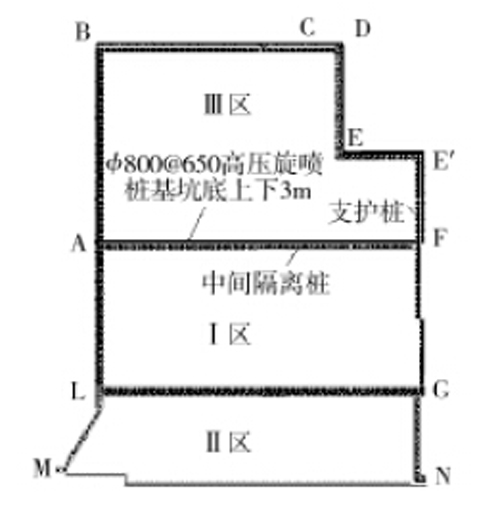 基于复杂多变的周边环境,结合分区设计与施工的原则,本工程基坑分3个区分别支护,即Ⅰ区、Ⅱ区及Ⅲ区(图2)。其中,Ⅰ区与Ⅱ区之间、Ⅰ区与Ⅲ区之间均采用隔离桩分隔。