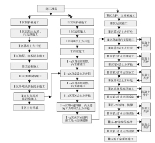 桩基及土方开挖施工顺序均为先施工Ⅲ-A区,再施工Ⅲ-B区。在进行Ⅲ-B区桩基施工时就提前插入Ⅲ-A区第1层土方开挖及第1道混凝土内支撑的施工。经过现场实施,在该基坑施工部署创新原则下,80d完成了紧邻地铁Ⅱ区基坑工程施工,将地铁保护区域的风险周期有效压缩在3个月以内。随即插入的Ⅰ区、Ⅲ区相继在110d及150d内完成了基坑及地下结构的施工,有效实现了基坑全面部署下的流水作业,赢得了工程总体工期,效益显著。