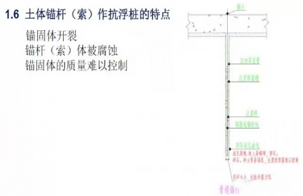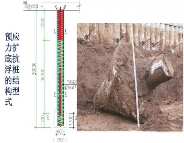 所谓抗浮桩,是指地下建筑结构低于地下水位,且结构自重不足以抵消水的上浮力时,为抵消地下水为结构产生的上浮力而在地集中设置的桩体。