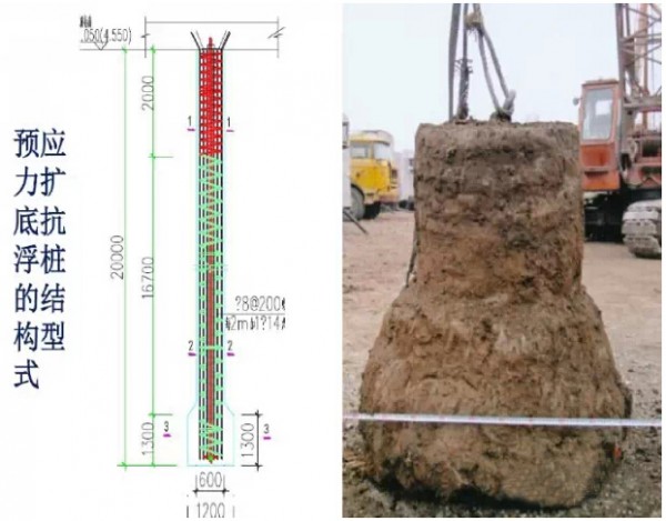 该抗浮桩体主要通过施工预应力控制桩体裂缝,节省钢筋用量,采用原状取土灌注桩技术成桩,达到了提高抗拔力和满足耐久性的要求。该技术具有施工速度快、无泥浆污染、无挤土效应、节省工程造价30% 的优点。