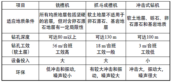 目前国内地下连续墙成槽机械主要有三种:双轮铣槽机、抓斗成槽机、冲击式钻机,其主要特点见表1。