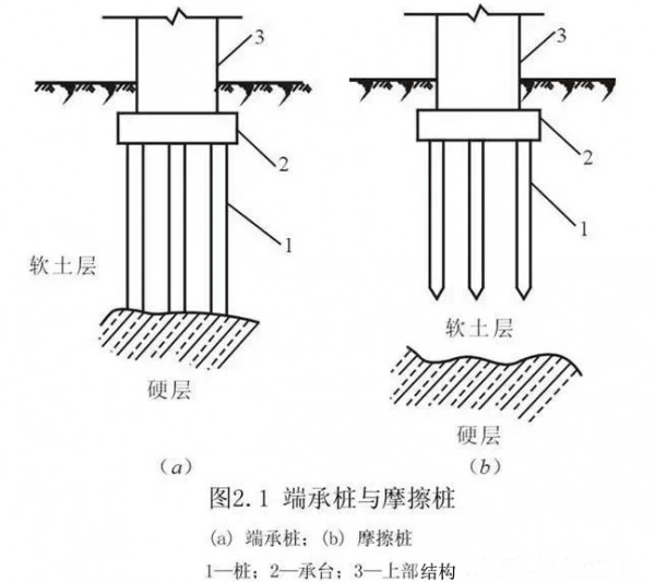 桩基础是一种常用的深基础形式,它由基桩和连接于桩顶的承台共同组成。若桩身全部埋于土中,承台底面与土体接触,则称为低承台桩基,若桩身上部露出地面而承台底位于地面以上,则称为高承台桩基。建筑桩基通常为低承台桩基础,而在桥梁、码头工程中常用高承台桩基础。