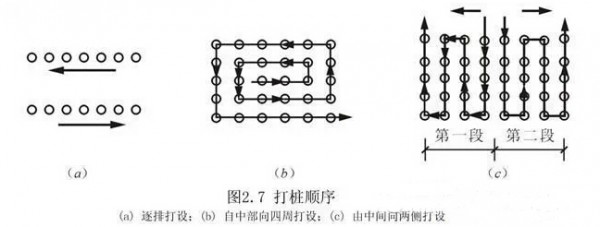 根据桩的密集程度,打桩顺序一般分为逐段打设、自中部向四周打设和由中间向两侧打设三种。
