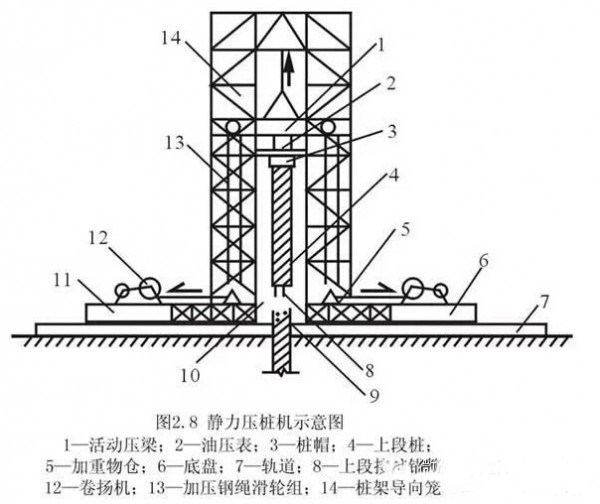 静力压桩是在均匀软弱土中利用压桩架(型钢制作)的自重和配重,由钢丝绳、滑轮和压梁,将整个桩机的重力(800~1500kN)反压在桩顶上,以克服桩身下沉时与土的摩擦力,迫使预制桩下沉,将桩逐节压入土中的一种沉桩方法。这种沉桩方法无振动、无噪音、对周围环境影响小,适合在城市中施工。 压桩施工一般采取分节压入、逐段接长的施工方法。