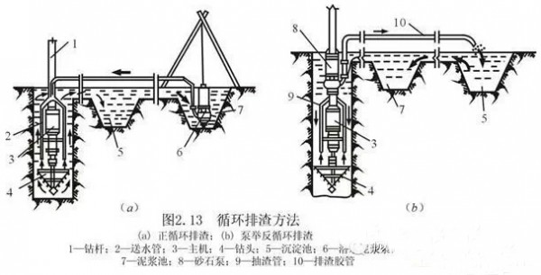 潜水钻机成孔。潜水钻机是一种旋转式钻孔机,其防水电机变速机构和钻头密封在一起,由桩架及钻杆定位后可潜入水、泥浆中钻孔。注入泥浆后通过正循环或反循环排渣法将孔内切削土粒、石渣排至孔外。