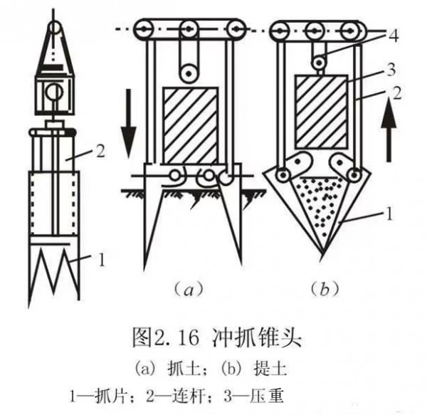 冲抓锥成孔;冲抓锥锥头上有一重铁块和活动抓片,通过机架和卷扬机将冲抓锥提升到一定高度,下落时松开卷筒刹车,抓片张开,锥头便自由下落冲入土中,然后开动卷扬机提升锥头,这时抓片闭合抓土。冲抓锥整体提升至地面上卸去土渣,依次循环成孔。