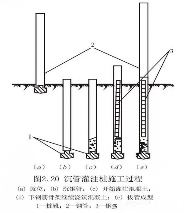 沉管灌注桩是利用锤击打桩设备或振动沉桩设备,将带有钢筋混凝土的桩尖(或钢板靴)或带有活瓣式桩靴的钢管沉入土中(钢管直径应与桩的设计尺寸一致),造成桩孔,然后放入钢筋骨架并浇筑混凝土,随之拔出套管,利用拔管时的振动将混凝土捣实,便形成所需要的灌注桩。