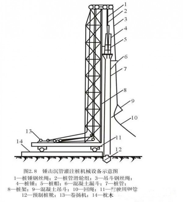 利用锤击沉桩设备沉管、拔管成桩,称为锤击沉管灌注桩;利用振动器振动沉管、拔管成桩,称为振动沉管灌注桩。