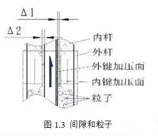 1.2、摩阻式钻杆 通过内、外键条加压面承受动力头驱动扭矩产生的正压力所形成的摩擦阻力来传递加压力,该种钻杆由此而得名。其发生“带杆”的机理是卡滞,不同于上述的机锁式钻杆。这种钻杆为便于通过,其内、外键条之间预留有一定的间隙,见图1.3所示,Δ1、Δ2通常在10-20mm之间。钻杆在加压钻进过程中还会有不同程度的磨损和变形,因此键条间隙并非完全均匀整齐,而是存在所谓的“锲形缝”。这给钻杆内部的各种“粒子”提供了进入和卡滞的机会。这些“粒子”包括沙粒、碎石块、毛刺和各种坠落物例如小螺钉螺母、铁片等,广泛浮游于泥浆中,游离在钻杆的内腔和键条间隙。当然,并非所有粒子都会造成卡滞而发生“带杆”。尺寸太大的粒子被“拒之门外”不能进入,尺寸太小的则“畅行无阻”顺利通过,两者都不会造成危害。只有那些接近间隙尺寸的粒子才有可能造成卡滞而引发“带杆”,这些粒子可称为“机会粒子”。另外,这些“机会粒子”还包括钻杆因长期使用,在键条和加压台等位置出现的飞边、毛刺和塌陷等缺陷,如未定期进行清除和打磨,缺陷出现积累效应,同样会引起“带杆”。这种卡滞式“带杆”也有可能发生在机锁式钻杆上,因为两个加压台之间的键条间隙与摩阻式钻杆相似。所以,保持泥浆清洁,定期检查和保养钻杆不但可延长其使用寿命,也可减少“带杆”故障的发生。