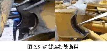 2.5、大构件 对包括桅杆、桅杆油缸、三角形和动臂等大构件都会产生一定的破坏作用。其中较严重的是动臂两端连接副的撕裂破坏,如图2.5所示。常规分析是焊接质量所致,并不怀疑设计,这是因为常规静态计算该构件强度没有问题。实际上焊接质量并不是全部或根本原因,由带杆产生的巨大冲击能量才是“罪魁祸首”。桅杆油缸活塞杆端耳被拉开的故障也可以认为是“带杆”所致。由以上计算可见,它是常规受力-主卷扬提升力的十几甚至几百倍,并且连续不断发生,必然引起断裂。