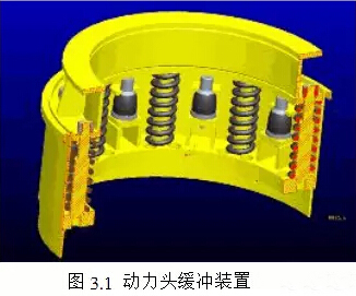3.2、5级减振技术:第1级-钻杆橡胶垫减震;第2级-重型弹簧减震;第3级-高弹橡胶减震;第4级-特种减震器(豹式坦克减震技术);第5级-大型挠性减震系统。这些缓冲减震技术应用的原始目的是为了吸收下钻作业冲击能量,减轻其破坏作用。动力头缓冲装置见图3.1所示。从以上计算可知,该装置不足以“消化吸收”“带杆”冲击能量。从理论上说,这部分结构能力应该加强,但在实践中却有很多困难。