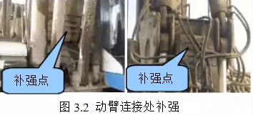 3.6、大构件如桅杆、三角形和动臂等都受到“带杆”冲击能量的破坏。例如桅杆导轨焊缝质量必须很好保证,特别是中下部。动臂两端连接副强度静态没有问题,关键要预防动态冲击的破坏作用。对动臂两端结构形式的加强是当务之急。图3.2为某厂家对动臂两端结构的补强方式。