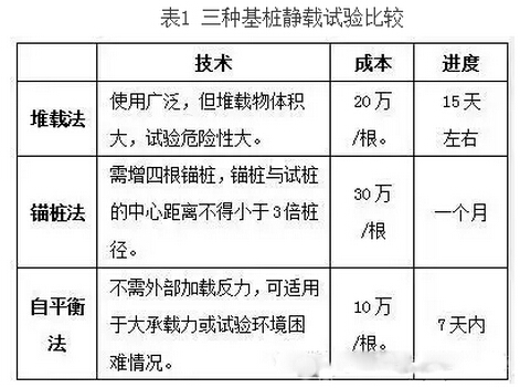 基桩静载试验主要有三种加载方法:堆载法、锚桩法和自平衡法。针对检测桩实际情况,对三种加载方法从技术、成本、进度方面进行了对比,可知自平衡法检测技术在大吨位试桩试验中具有不可比拟的优势,特别适用于类似本工程的上下同步逆作法工程的静载试验,如表1所示。