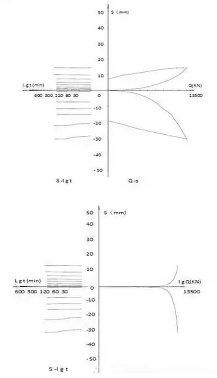 依据现场实测的数据绘制了自平衡法静载试验曲线,详见图4。上段桩的加载极限值Quu=13500KN,下段桩的加载极限值Qlu =13500KN,荷载箱上部桩自重W=2000 KN,根据公式(1)得出该检测桩的抗压极限承载力Pu=27875 KN,满足设计承载力特征值27000kN的要求。
