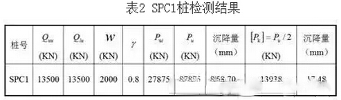 SPC1桩抗压极限承载力为27875kN,根据等效转换桩顶加载曲线,其对应沉降量为58.70mm,承载力特征值为13938kN,满足设计承载力特征值13500kN的要求。对应沉降量为17.48mm,满足规范差异沉降不宜大于1/400柱距,且不宜大于20mm,详见表2。
