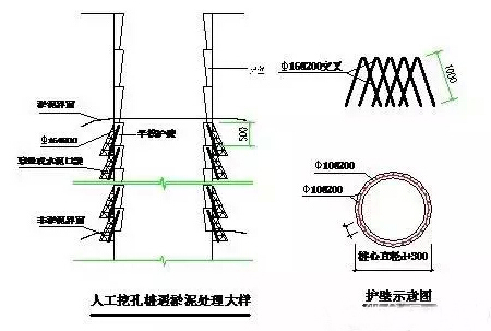 在人工开挖之前,制作不同高度的护壁模型,如200—500mm不等,先将长约1.0m左右、16mm的钢筋从护壁外侧插下(用于撑挡砂滤材料)间距@150,并将其砸下与上部钢筋进行可靠绑扎。随着深度的不断增加,在钢筋外围不断地加设挡砂过滤材料,如竹篱、砂袋、稻草等,以防止护壁外侧泥砂从上部落入桩内,并不断地加设护壁箍筋并尽快进行绑扎。但其高度不宜过高,控制在20—1250px即可,既要有一定的强度,还要将其与上层护壁闭合,这样才能有效地阻止外围的砂子涌进桩孔内。挖好后尽快将模型安装好浇筑混凝土。