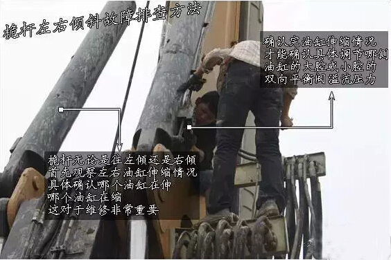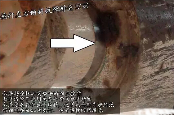 如果将桅杆与变幅平衡阀互换后,故障消除了说明就是平衡阀故障所致,如果依然存在桅杆偏移,说明是油缸内泄所致,仔细观察油缸活塞杆,会有慢慢缩回现象。