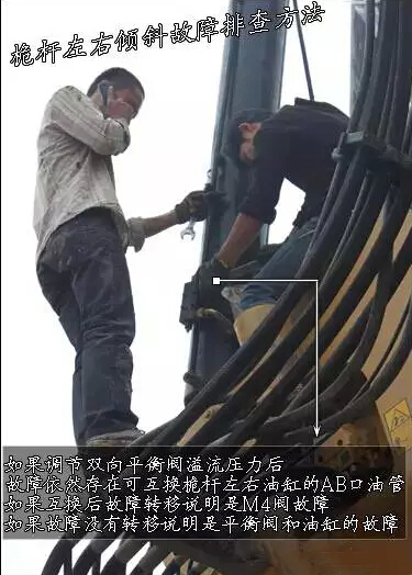 如果调节双向平衡阀溢流压力后故障依然存在,可互换桅杆左右油缸的AB口油管,如果互换后故障转移说明是M4阀故障,如果故障没有转移说明是平衡阀和油缸的故障。