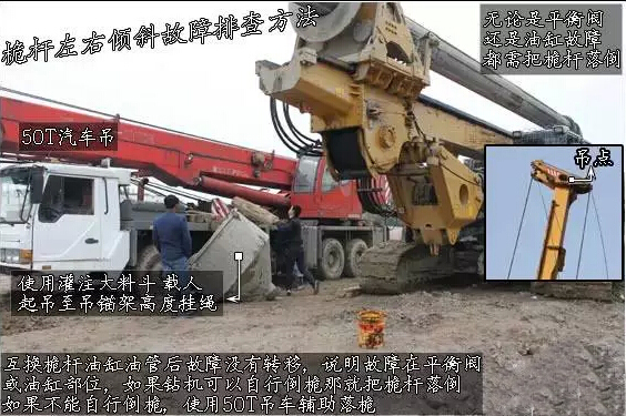 互换桅杆油缸油管后故障没有转移,说明故障在平衡阀或油缸部位,如果钻机可以自行倒桅那就把桅杆落倒,如果不能自行倒桅,使用50T吊车辅助落桅。