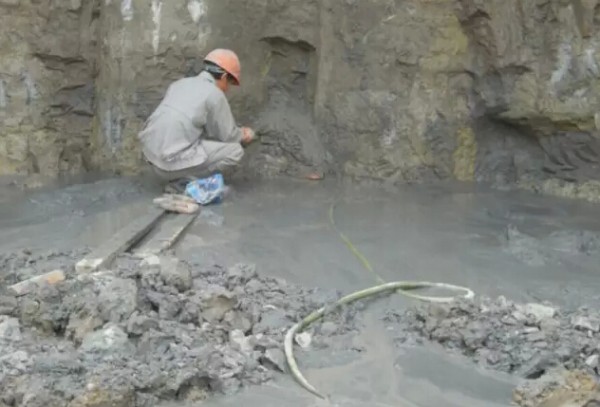5、注水泥浆:按照水灰比0.7:1搅拌水泥浆,先注入水泥浆确认注浆管是否在漏水通道附近,如注浆过程中持续注浆未流出水泥浆,可适当提升注浆管15~20cm,漏水点流出水泥浆后才能确认找到漏水通道。