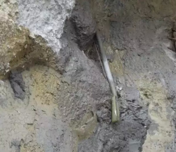 4、插入导管:在楔形孔洞底部将拌制好的水泥平铺一层,厚度约为孔洞的三分之一,快速将事先准备好的长度约1.5m的Φ25塑料管(管径根据漏点水流量调整)一端插入到漏水点深处,将水管压入平铺的水泥内,确认漏水点水流从管内流走时继续铺拌制好的水泥固定导水管,见图6。