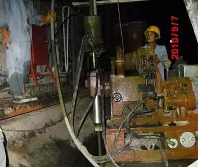3、钻进成孔:采用汽车吊将钻机在漏水点处就位,调整好垂直度后开始钻孔,钻孔深度为漏水点下1m左右,钻孔见图9所示。