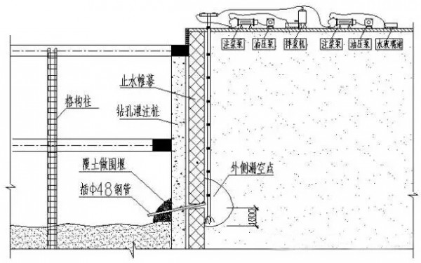 (1)静压注浆:漏水点堵住后24h后静压注浆加固,加固点布点沿止水帷幕方向距离堵漏点左右各0.5m位置设置一个加固点,注浆深度为漏水点下1m,流量为8~12L/min,加固时注浆压力在1~1.5MPa以上。