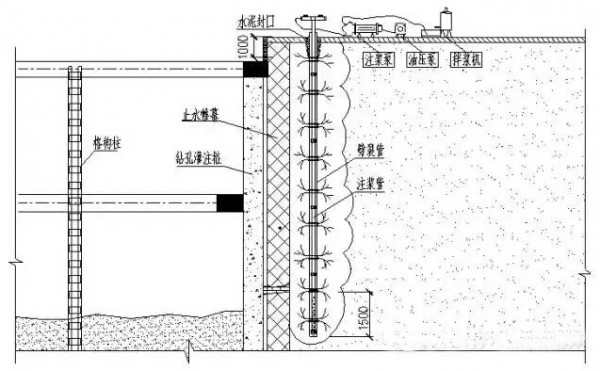 6、双液注浆:双液注浆是静压注浆中的一种,即利用液压通过注浆管把水泥溶液和水玻璃短时间内混合均匀生成水泥胶,然后注入地层中。利用水泥胶凝结速度快,强度提高快的特点封堵渗漏通道,达到堵漏目的。
