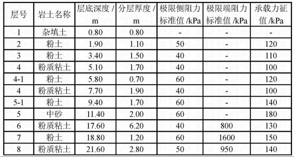 由验算可知,以上3层土理论上都可以做为桩端持力层,但在实际应用上差别很大。用第6层做为桩端持力层,桩长约12m,用第8层做为桩端持力层,桩长约19m。而在实际设计中选用了第8层做为桩端持力层,安全系数增大,但却造成了时间以及经济上的浪费。