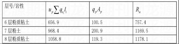 表一中给出了20m以上地基土的技术参数,现就第6层粉质粘土、第7层粉土、第8层粉质粘土(表中未到层底,仅作说明)作为桩端持力层进行验算,结果见表2。