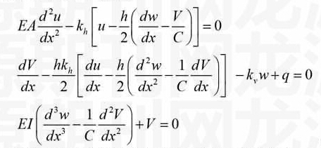 其中,、、分别为地基法向反力系数、切向反力系数和梁的挠度。由式(2-5)可得到以位移、和剪力表示的梁的平衡方程如下