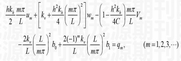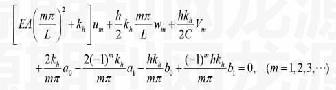 式(9-12)和(15)即为本文得到的求解弹性地基梁代数方程组。若级数取到前项,则待定系数、、及、、、总共有个,由式(9-12)和(15)组成的代数方程组中也共有个代数方程,因此问题可解。由式(9-12)和(15)求出系数、、及、、、后,代入式(8),可得到位移、及广义剪力(剪力接着由式(4)、(5)求出),再由式(4)、(2)可得到转角、轴力及弯矩。