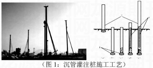 上图中的(a)——(e)分别代表就位、沉钢管、开始灌注混凝土、下钢筋骨架继续浇筑混凝土以及拔管成型;1-3分别代表的是桩尖、钢管以及钢筋。