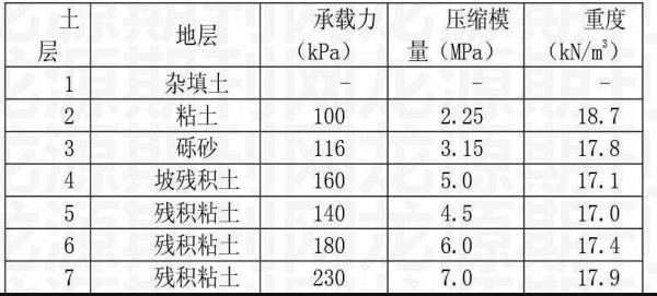 本文以广东省惠州市某建筑作为工程实例加以研究。已知该建筑为现浇钢筋混凝土框架结构、基本柱网尺寸有6.6m×7.5m和6.6m×6.6m两大类,采用十字交叉梁基础,其宽度为2.1m,埋深为2.1m。根据工程建筑的要求,地基承载力的设计值为220kPa,综合勘测结果表明,建筑场地的各土层力学指标如下表所示。