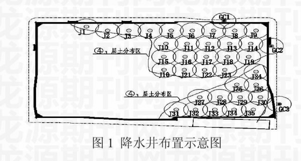 本工程采用真空深井进行坑内降水,在基坑东侧微承压水区域布设降水井35口(含1口观测井),坑外布置3口观测井兼做备用井。使承压水水头高度控制在开挖面以下0.5m,深井深度以进入④3层底部为原则。施工前对降水井位置进行优化,避开地下室基础梁、承台,避免井管对结构造成影响,降水过程中,注意对水位的监测,确保降水满足施工要求。施工过程中注意对降水井的保护,避免土体掩埋,机械设备损坏。降水井布置如图1所示。