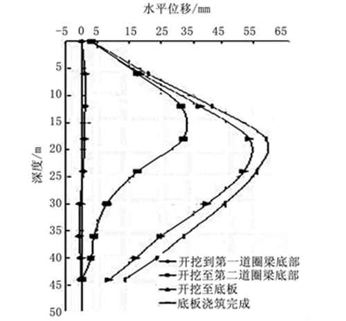(3)在开挖至第二道圈梁时,变形量约为最大变形量的1/2。随着基坑开挖深度的不断增大,测斜变形量逐渐增大,变形速度越来越快。