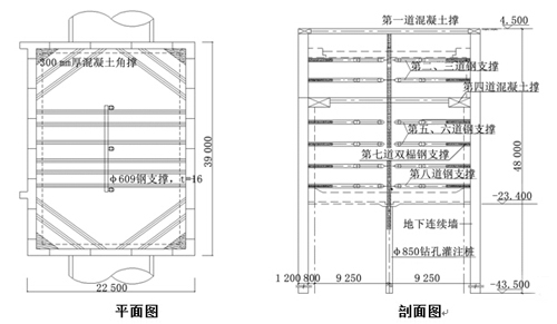 基坑平面尺寸为39m×22.5m,围护采用了厚1200mm的地下连续墙,地下连续墙深48m,基坑开挖深度为28m;坑内共设8道支撑,第一道为1000mm×800mm的钢筋混凝土支撑,第四道采用1000mm×1000mm钢筋混凝土支撑,第二、三、五、六、八道采用直径为609mm的钢管支撑,第七道钢管支撑为双榀,见图2。