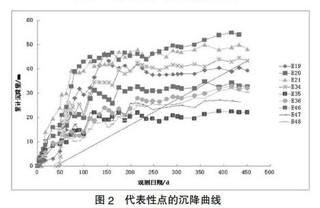 工后沉降曲线可以以观测后100~113d(2013年5月上旬)为界划分为两个阶段,前一阶段曲线较陡,E46点所发生的沉降量为44mm,日均沉降速率为0.40mm/d;后一阶段曲线逐渐变缓,E46点所发生的沉降为11mm,日均沉降速率为0.03mm/d。主要原因是在前期发生的主要是瞬时沉降,且受工程干扰,后期沉降曲线进入主固结阶段,沉降曲线逐渐转缓。