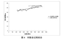 图3和图4分别为双曲线法和对数法对沉降全过程拟合关系图。强夯施工前期,沉降速率很大,施工后进入自然沉降期。从图3可以看出沉降数据进行双曲线全过程线性拟合时,拟合线与数据点重合度较好,而且从表2中可以看出其各点间相关系数很高。从图4中可以看出沉降数据进行对数曲线全过程线性拟合时,拟合线与数据点重台度不太好,且从表2中可以看出其各点间相关系数稍低。从图3中可以看出双曲线预测沉降线比对数曲线预测沉降线更接近实测沉降线。因此,双曲线模型预测机场沉降的收敛性与实际机场后期沉降的逐渐收敛特性相适宜。由于对数模型预测本身的发散性,相比之下该模型可能更适宜机场地基前期沉降预测和大型工程的沉降预测。双曲线预测模型由于后段拟合较好,可能更适合机场地基后期沉降预测。由表2中可以看出目前的观测数据条件下,道面实际累计沉降已接近预测最终沉降量,说明地基固结程度已较高,地基土已较为密实,在现有场地条件下继续沉降量应较为微小。