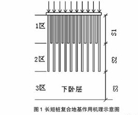 刚性长短桩复合地基[3]中,因长桩和短桩的间隔设置,在复合地基中形成三个不同作用的工作区域,即以提高承载力为主的长、短桩联合工作区(1区)、以减少沉降为目的的长桩工作区(2区)、承受桩体荷载的持力层(3区)、三区共同作用,以提高浅层地基承载力、减少地基沉降、形成良好的长短桩复合地基。其作用机理如图1所示