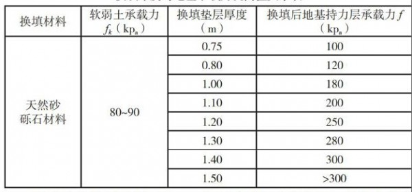 软弱地基土的承载力特征值一般为fk=80~90kpa,在1~2m换填厚度前提下,处理后的地基承载力,根据不同的换填材料,也可提出一个经验值范围,天然砂砾石料地基承载力可达fk=200~300kpa;中砂、砾砂fk=150~200kpa。但由于上述换填厚度与提高的地基承载力经验值范围都较大,运用起来不好操作和掌握,作者运用下述两种方法对换填厚度相对应提高的地基承载力值进行了细分和定量分析: